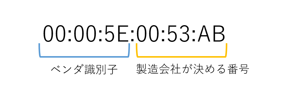 前半6桁はNICの製造会社ごとに割り振られており、「ベンダ識別子」と呼ばれます。