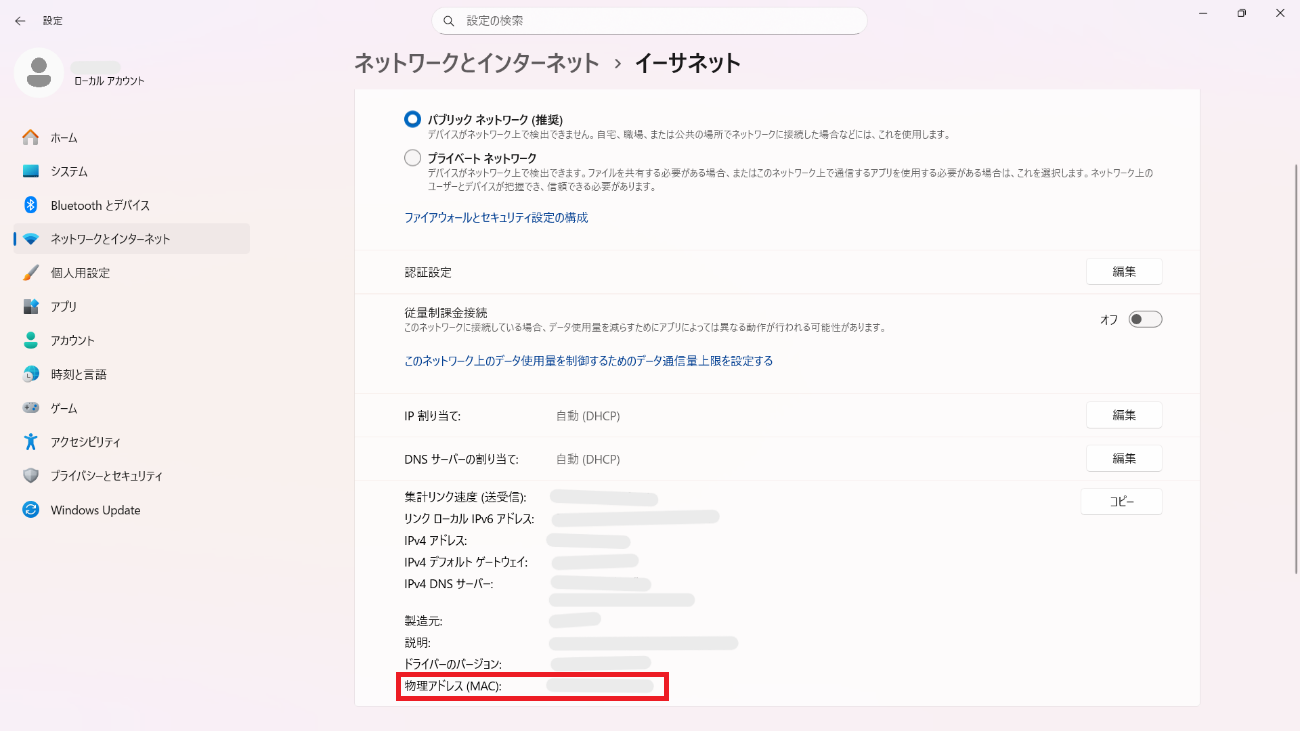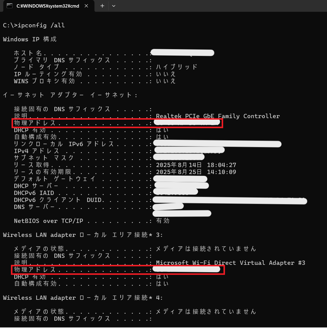有線LANと無線LANでMACアドレスが異なるので、それぞれ紹介します。