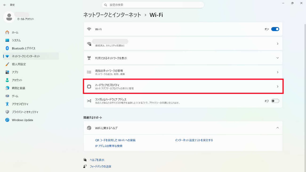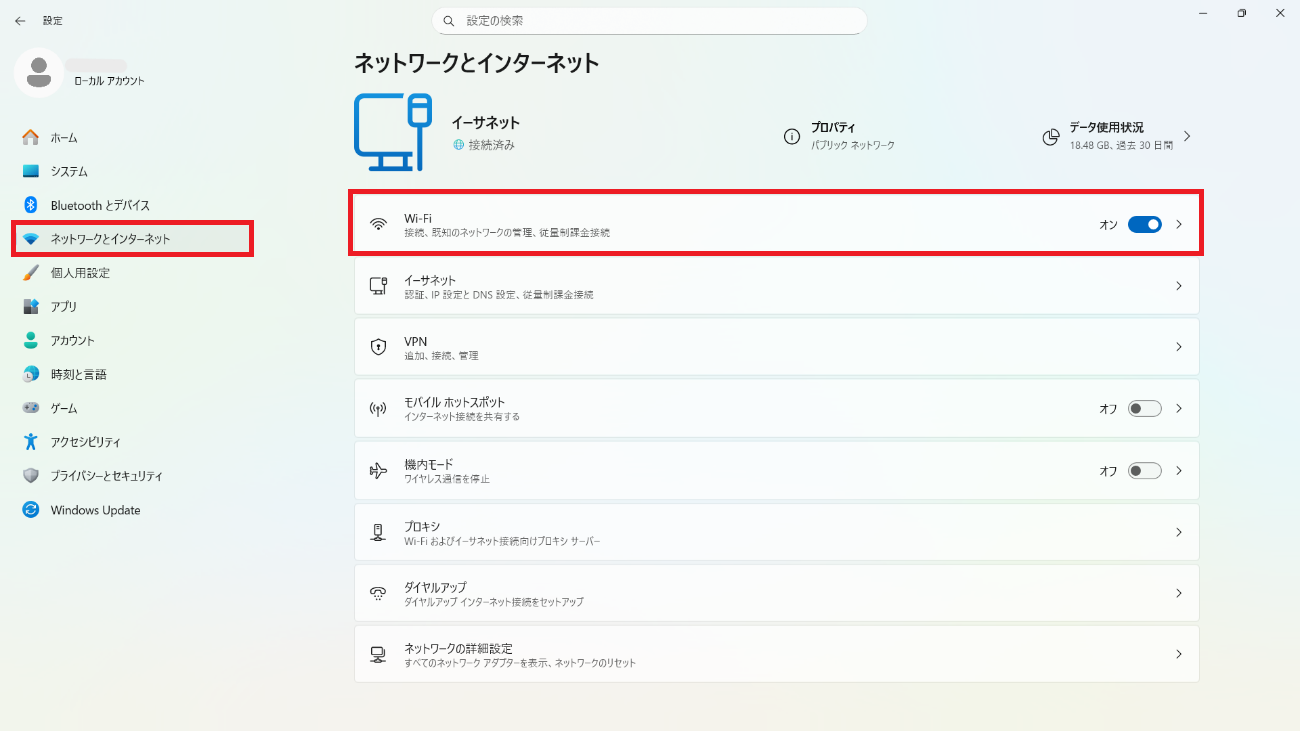 有線LANと同様に設定のネットワークとインターネットの画面を開きます。