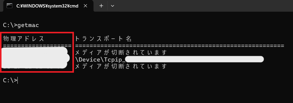 コマンドプロンプトでは「getmac」コマンドと、「ipconfig /all」コマンドの2つでMACアドレスを確認することができます。